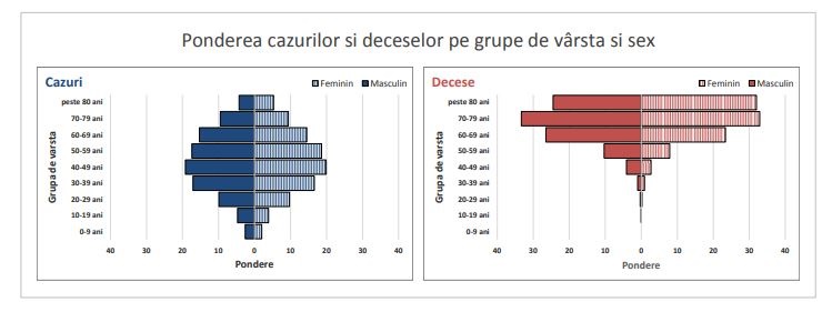 Referitor la numărul de decese pe grupe de vârstă şi sex, se observă, până la 5 septembrie 2021, că cea mai mare pondere a deceselor la femei era la grupele de vârstă 70-79 de ani (aproximativ 34%) şi peste 80 de ani (aproximativ 33%); următoarea categorie cea mai afectată la femei era grupa de vârstă 60-69 de ani (aproximativ 24%). Şi la bărbaţi, grupa de vârstă 70-79 de ani era cea mai afectată, cu un procent de mortalitate de 34; următoarele grupe de vârstă cele mai afectate, la bărbaţi, erau 60-69 de ani (aproximativ 27%) şi peste 80 de ani (aproximativ 24%), conform www.cnscbt.ro. Se observă, astfel, o diferenţă între bărbaţi şi femei la categoria de vârstă peste 80 de ani, femeile înregistrând o mortalitate de 34%, în timp ce bărbaţii un procent de 24.