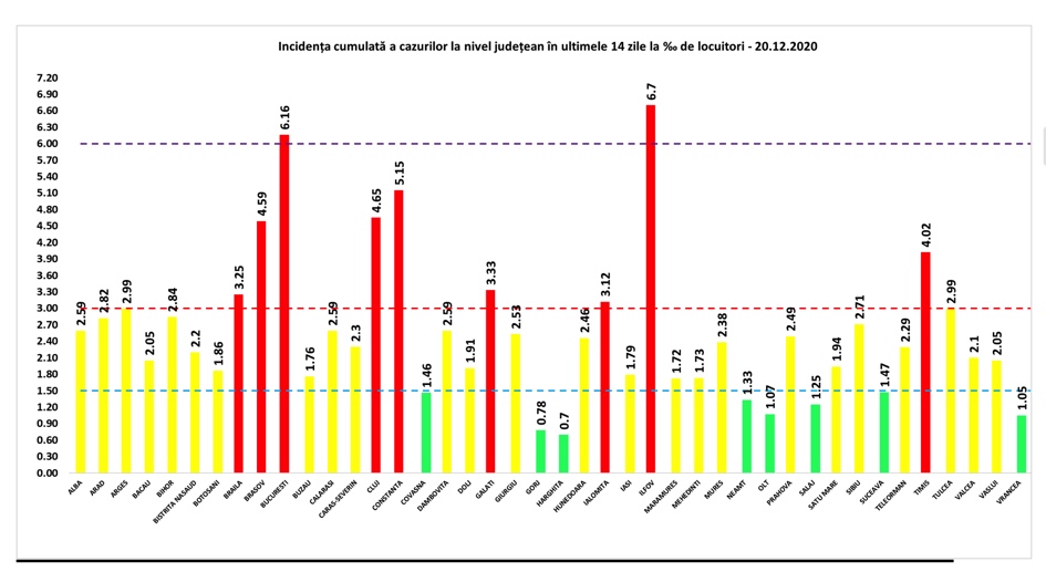 Coeficientul infectărilor cumulate la 14 zile, raportate la 1.000 de locuitori este calculat de către Direcțiile de Sănătate Publică, la nivelul Municipiului București și al județelor. Mai jos aveți graficul realizat în baza raportărilor primite de CNCCI de la Direcțiile de Sănătate Publică: