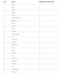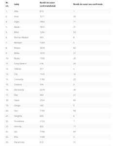 Distribuția pe județe a cazurilor per total și a celor noi o regăsiți în tabelul de mai jos: