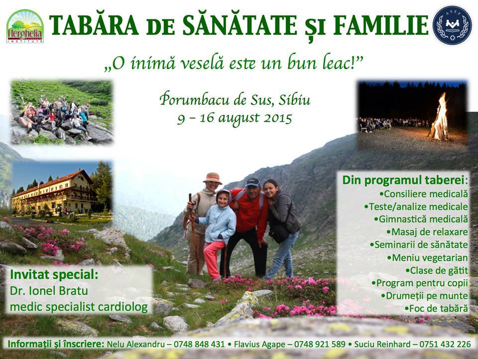 Centrul de medicină Lifestyle „Herghelia”, Asociaţia pentru Sănătate, Educaţie şi Familie „Sanogen” organizează între 9 şi 16 august, „Tabăra de sănătate şi familie”. Acţiunea va avea loc în localitatea Porumbacu de Sus, din judeţul Sibiu. Timp de şapte zile, cei prezenţi vor putea să se bucure de o perioadă de relaxare în mijlocul naturii, de o relaţie plăcută cu echipa organizatoare şi cu ceilalţi membrii ai taberei, şi bineînţeles, de informaţii utile în domeniul sănătăţii şi al vieţii de familie. Aceştia vor beneficia de consiliere medicală, masaj, gimnastică medicală, alimentaţie zero colesterol, clase de gătit, meniu vegetarian, program special pentru copii. Ei vor avea parte de drumeţii (muntele Negoiu, Transfăgărăşan, Bâlea cascadă şi Bâlea lac), excursii, poveşti în natură şi focuri de tabără. De asemenea, ei vor avea parte şi de teste medicale, teste ce le vor spune despre nivelul tensiunii arteriale, indicele de masă corporală, vârsta inimii, colesterol sau glicemie. Toate acestea constituie momente de deconectare şi de reîncărcare a sufletului faţă de ritmul alert al vieţii.