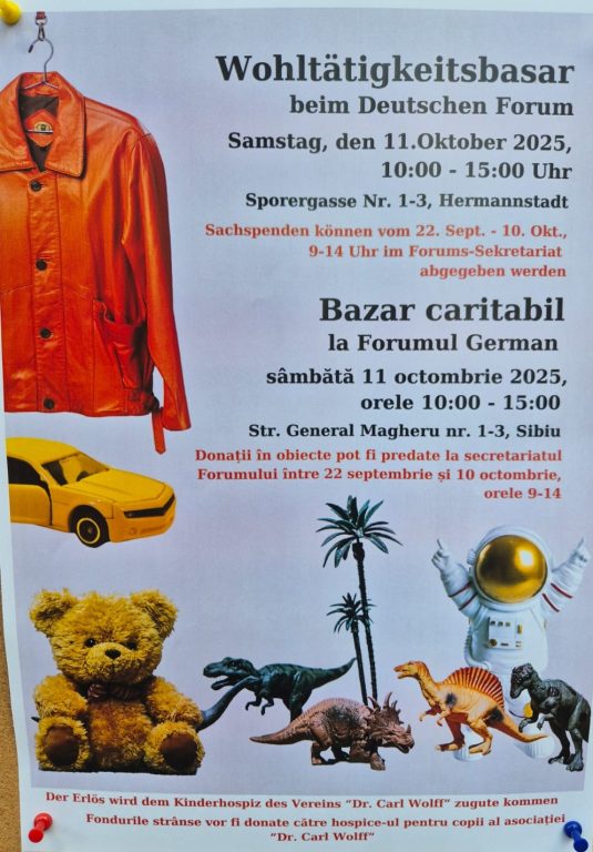 Sâmbătă, 11 octombrie, sibienii sunt așteptați în număr cât mai mare la bazarul caritabil organizat de Forumul German, între orele 10-15, în Sala Oglinzilor din sediul forumului, de pe Str. Gen. Magheru, Nr.1-3 din Sibiu.