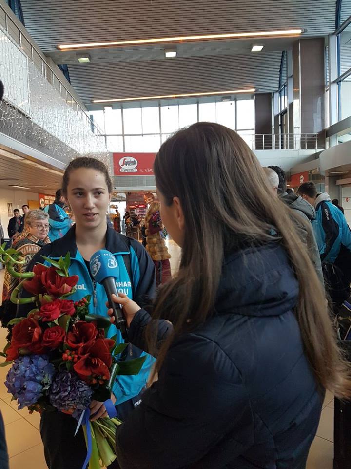 Andreea Dragoman: În primul rând, când am ajuns la Aeroport ne-au aşteptat televiziunile şi cei de la Federaţie cu flori. Nu ni s-a mai întâmplat niciodată acest lucru. Ne-am bucurat foarte mult. La sală când am ajuns am avut o surpriză din partea clubului. Au făcut un tort mare pentru mine, cu o imaginea a mea şi a Adinei. A fost foarte bun.