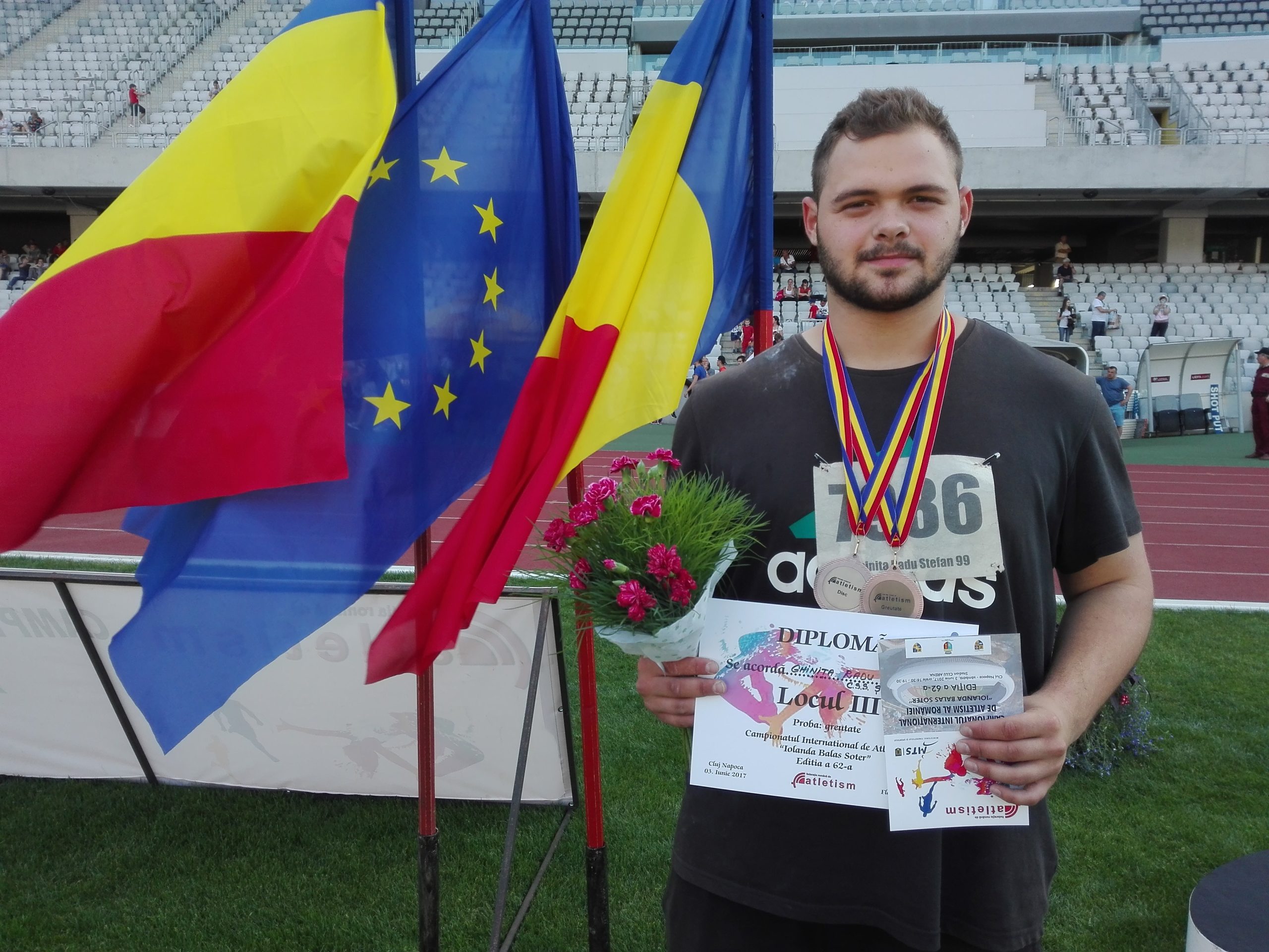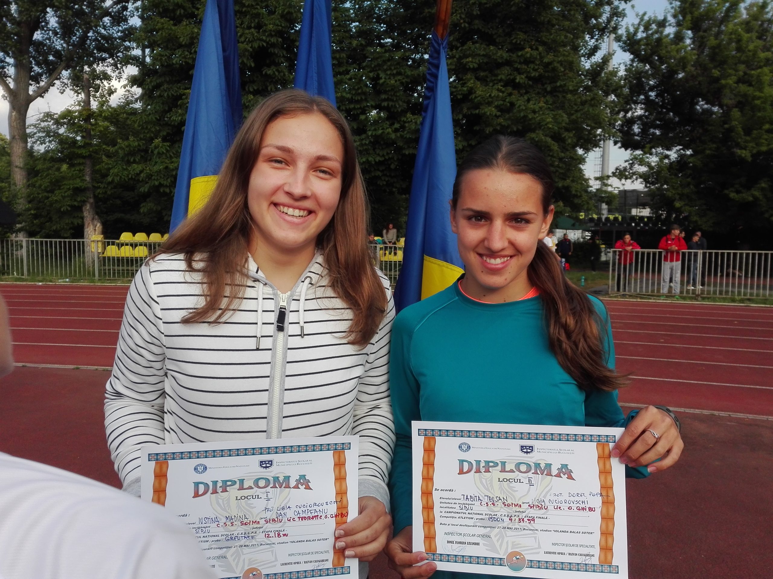 44 de metri și 49 centimetri a fost distanța aruncată de Radu Ghiniță a discului de 1750 de kilograme, la Campionatele Naționale Școlare. Distanță care i-a adus medalia de aur la competiția desfășurată la București. ”M-am simțit foarte bine la școlare, chiar dacă la aruncarea greutății nu am venit în primii 3. A fost un concurs foarte bun”, a declarat campionul național. Iustina Madina a urcat de două ori pe ultima treaptă a podiumului, la aruncarea discului (38.31m) și la aruncarea greutății (12.18). La a doua categorie, ea a reușit un nou record personal. ”La școlare m-am simțit foarte bine, mi-am făcut record personal la greutate. Pentru viitor o să particip la Campionatul Național de Tineret și Seniori. Vreau să-mi fac recorduri personale la disc și la greutate”, a declarat Iustina. Tabita Teușan a fost ultima medaliată de la CNȘ. Tabita a fost a treia, alergând cei 1500 de metri în 4 minute, 37 de secunde și 59 de sutimi. Timp, care este cel mai bun al său pe această distanță. ”M-am simțit foarte bine. Nu a fost maximul, dar a fost destul de bine. Acum o să mă pregătesc pentru Campionatul Național de Juniori II, unde vreau să fac baremul pentru FOTE (Festivalul Olimpic al Tineretului European)”, a declarat Tabita.