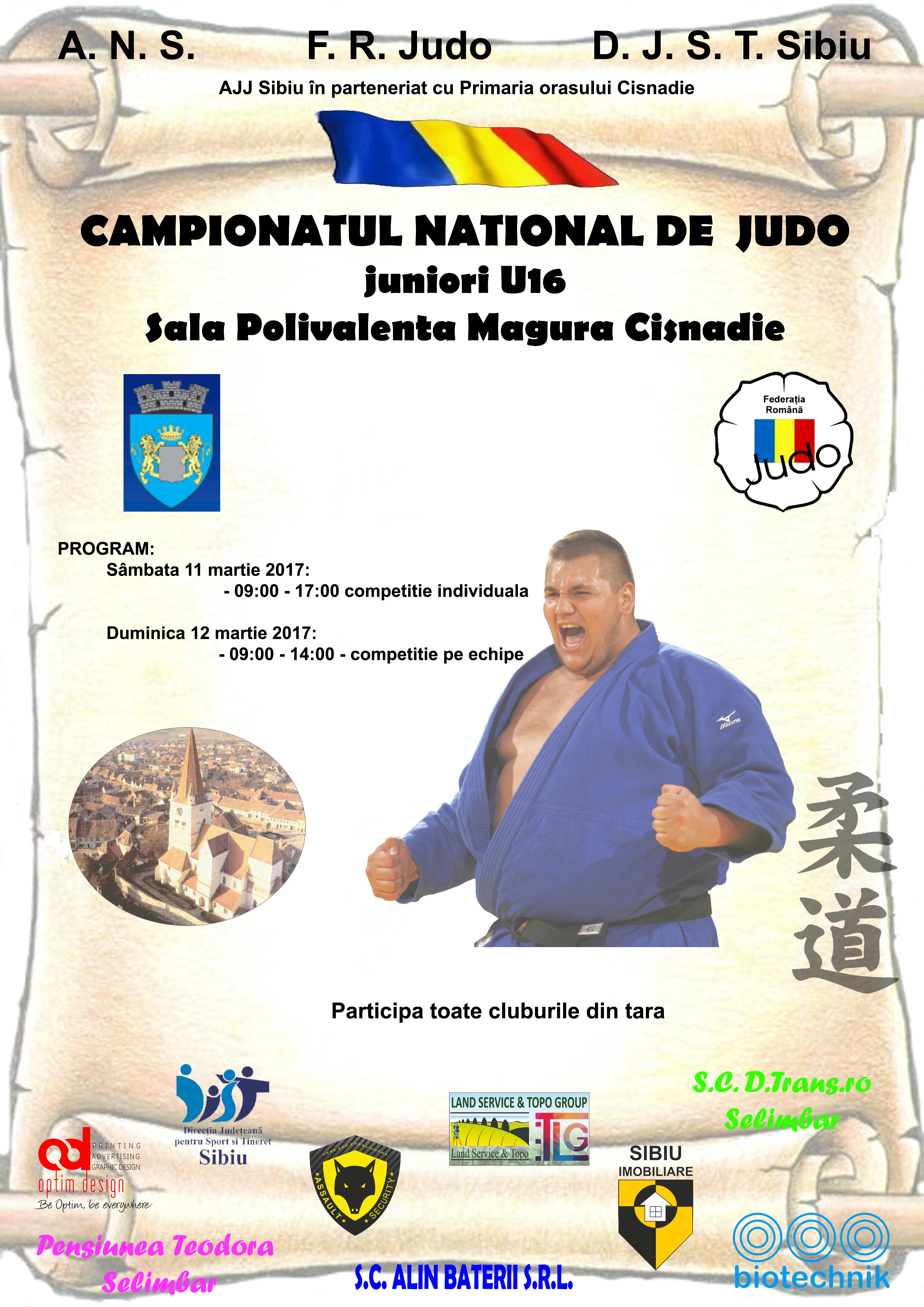 Afis CN juniori 2017 CisnadieTimp de două zile, judo-ul devine cel mai important sport în Sala Polivalentă „Măgura” din Cisnădie. Sâmbătă şi duminică, cei mai buni sportivi sub 16 ani din ţară vor concura pentru aurul Campionatelor Naţionale de juniori. Competiţie unde vor participa toate cluburile din România. Evenimentul este organizat de către Federaţia Română de Judo prin Asociaţia Judeţeană de Judo Sibiu, în parteneriat cu Primăria Cisnădie. Concursul va avea loc după următorul program: