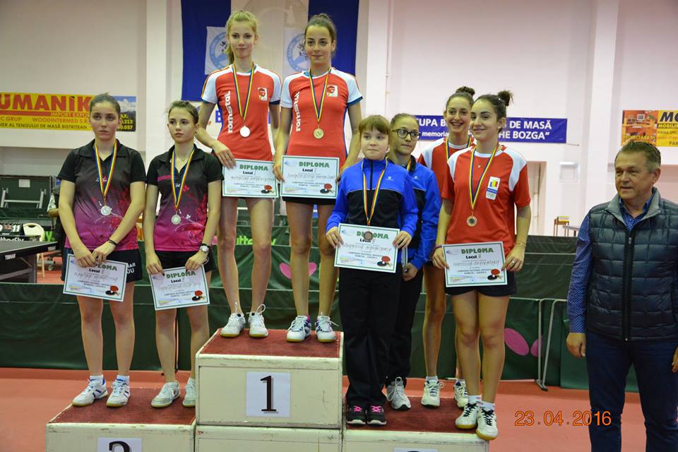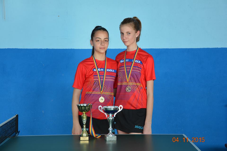 Dublu compus din jucătoarele Cristina Dumitrescu şi Diana Muntean a cucerit medalia de aur la Campionatul Naţional de Tenis de Masă al Juniorilor II. Evenimentul s-a desfăşurat la Bistriţa în perioada 22-24 aprilie. Elevele lui Gheorghe Vaida de la Clubul Sportiv Romgaz din Mediaş au câştigat toate cele 5 partide avute în competiţie, 3-0 împotriva dublului Herineanu-Tîrsu (turul I), 3-0 cu Deca-Malea (optimi), 3-0 cu Mihai-Ionică (sferturi), 3-0 cu Popescu-Bibirică (semifinale) şi 3-2 contra dublului format din tenismenele echipei gazdă, LPS Bistriţa, Tania Plaian şi Krisztina Varga (finală). Este a doua oară în care Cristina (foto sus stanga) şi Diana (foto sus dreapta) sunt învingătoare în această probă, după victoria din 2014.