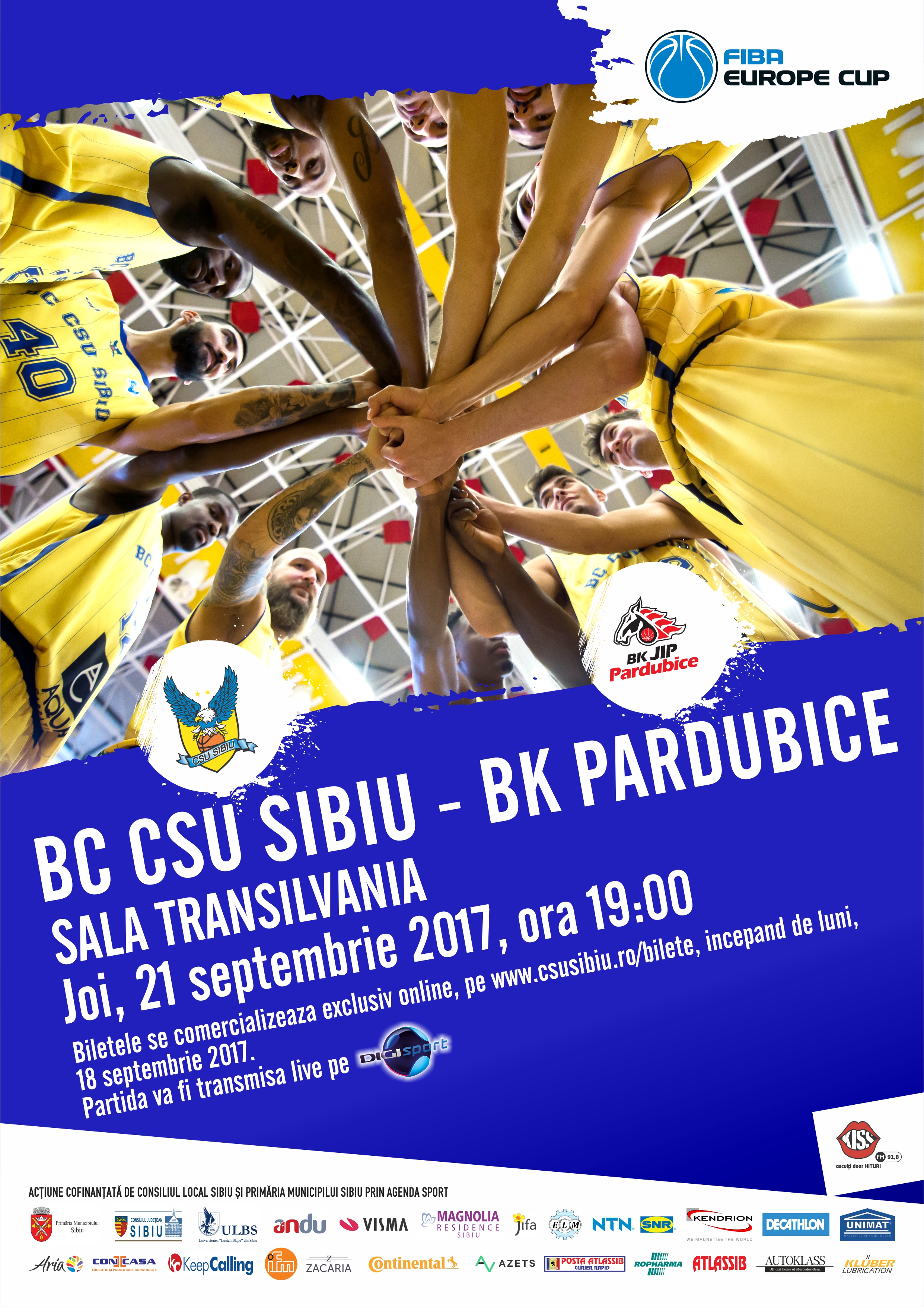Ziua de 21 septembrie este una specială pentru toată suflarea galben-albastră! CSU Sibiu revine după 9 ani în cupele europene, iar fanii, jucătorii, antrenorii și toți oamenii care susținut echipa noastră vor fi trup și suflet pentru victorie în fața cehilor de la BK Pardubice. Partida se ține în Sala Transilvania, joi de la ora 19,00. Va fi turul dublei împotriva cehilor. Duelul se poate vedea în direct și pe Digi Sport 2. Înainte cu două zile de primul tur preliminar din FIBA Europe Cup, baschetbaliștii sibieni sunt încrezători în propriile forțe, deși, la prima vedere, adversarii par a fi favoriți. Pardubice a participat și în sezonul precedent în FIBA Euro Cup. Atunci, ei au întâlnit în grupe tocmai pe marea rivală a ”vulturilor”, Universitatea Cluj, câștigând un joc și pierzând altul.