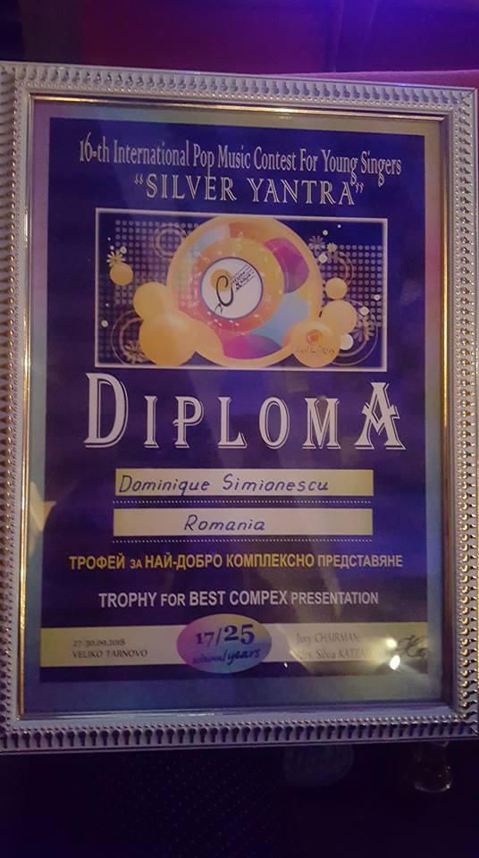 Dominique Simionescu s-a întors din Bulgaria cu trofeul pentru cea mai bună interpretare la grupa ei de vârstă. Acolo, ea a participat la cea de-a 16 ediție a Festivalului Internațional Silver Yantra. În total la această competiție au fost 86 de concurenți din Bulgaria, Italia, Cipru, Polonia, Malta și România. Deși nu a implinit 17 ani, Dominique a participat la grupa 17-25 ani alături de alți 17 concurenți și a convins că este cea mai bună.