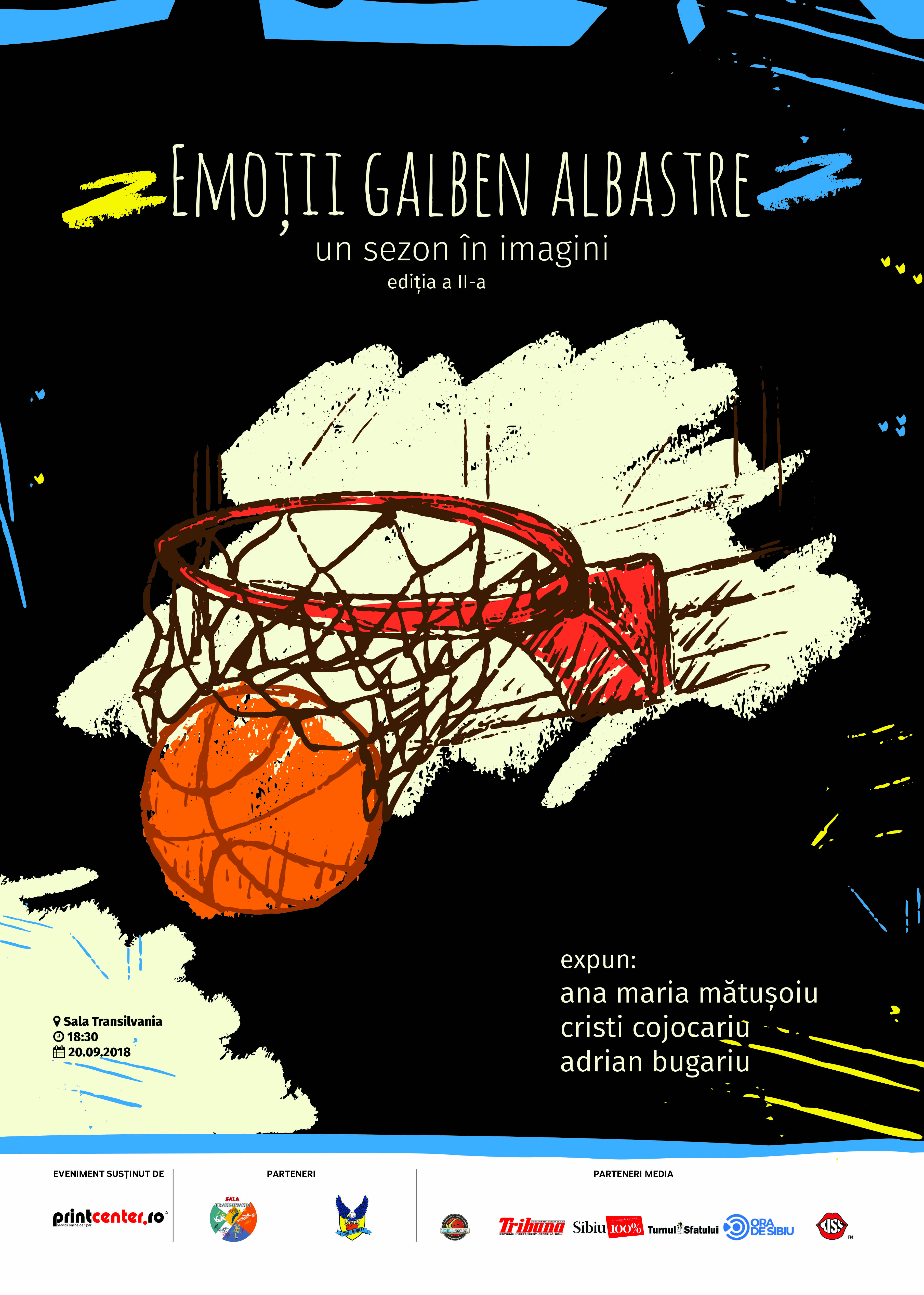 Expoziția de fotografie „Emoții galben-albastre” revine în Sala Transilvania odată cu primul meci de baschet din acest sezon al formației BC CSU Sibiu. Ana-Maria Mătușoiu, Adrian Bugariu și Cristian Cojocariu vă invită să descoperiți fotografiile surprinse de aceștia de-a lungul sezonului precedent, în ediția a doua a expoziției „Emoții galben-albastre”, ce cuprinde 31 de lucrări. Vernisajul expoziției va avea loc în data de 20 septembrie, în prima zi a Memorialului „Elemer Tordai”, în holul Sălii Transilvania, începând cu ora 18:30.