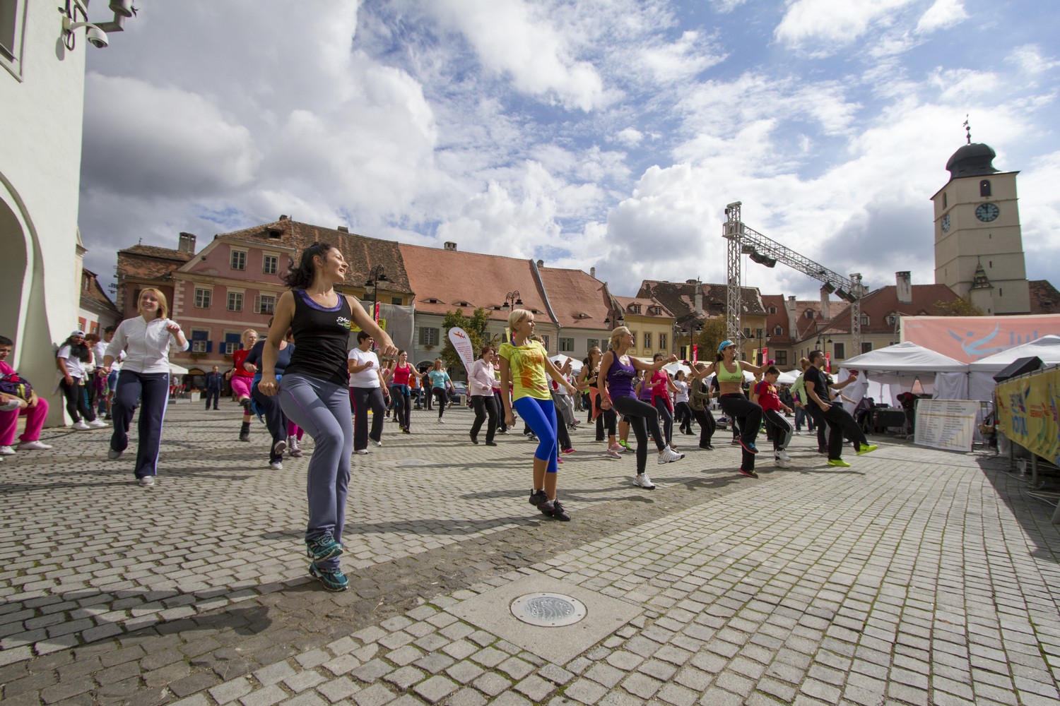 Festivalul Sportului 2013-260Festivalul Sportului se întoarce în seâmbăta aceasta. Evenimentul este la cea de-a doua ediţie şi va avea loc în Piaţa Mică. Începând cu ora 10 dimineaţa, sibienii sunt invitaţi la o demonstraţie de atitudine, energie debordantă şi bună dispoziţie. Cele mai interesante trenduri şi concepte sportive, vor fi arătate într-un melanj inedit al mişcării în aer liber. Timp de zece ore, cei mai buni instructori din Sibiu vor urca pe trei scene amplasate ca şi în anul precedent, loc de unde vor face mişcăre în ritm de Kangoo Jumps, Bokwa, Steel Programs, Schwinn Cycling, Step Aerobic, Tae Bo, X Tempo, Reebound, Taezu, Dance, Freestyler, Zumba Step, Zumba și deepWORK .