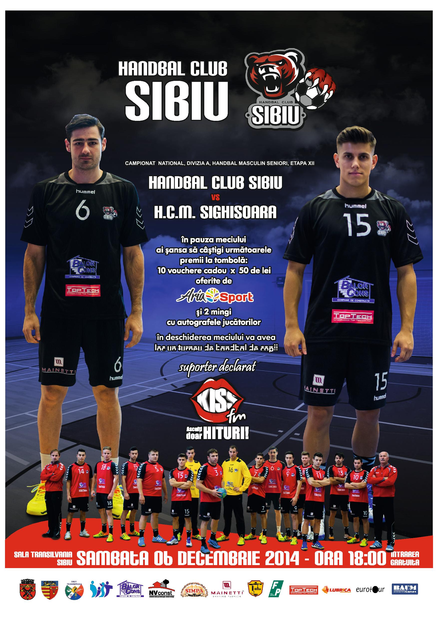 HC Sibiu încheie meciurile pe teren propriu din prima parte a campionatului în acest week-end. Sâmbătă seara, roş-negri vor întâlni pe HCM Sighişoara. Partida va începe de la ora 18,00 şi va conta pentru etapa cu numărul XI a sezonului de Divizia A. Meciul va avea loc în Sala Transilvania şi aduce un nou duel între cele două formaţii, dispute valabile încă din primul an al existenţei clubului sibian. La pauza jocului de seniori, spectatorii vor avea şansă să participe la deja obişnuita tombolă, şi să câştige fie un premiu conţinând 10 vouchere cadou şi 50 de lei oferiţi de Aria Sport, fie două mingi de handbal cu autografele jucătorilor. Intrarea este liberă. În deschiderea meciului va avea loc un turneu de handbal pentru copii cu vârste cuprinse între 7 şi 11 ani. „Aşteptăm cât mai mulţi fani la ultimul nostru meci pe teren propriu din acest tur de campionat. Ne dorim să facem un meci bun şi să câştigăm în faţa suporterilor noştri”, a spus antrenorul Ştefan Nicolae.