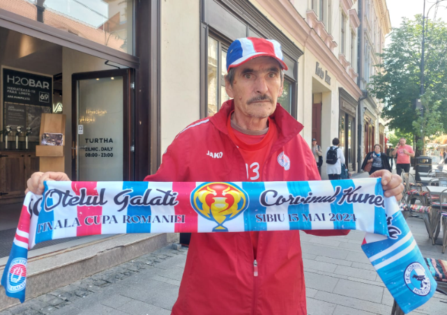 Pe strada Nicolae Bălcescu, l-am întâlnit pe Nicolau Gheorghe, un suporter de 71 de ani venit cu trenul din Galați: „Cred că sunt unul dintre cei mai vechi suporteri ai echipei. Am casă lângă Râmnicu Sărat, dar am buletin de Galați și fac naveta între cele două localități. M-am bucurat că finala se joacă aici și nu la București. Sibiul mi se pare frumos, am mai fost aici și am vândut tablourile pe care le pictez,” ne-a declarat gălățeanul.
