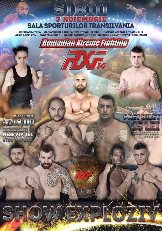 K1Cei mai importanţi luptători locali şi naţionali vor fi prezenţi la Sibiu, pregătiţi să ofere un show exploziv. În 3 noiembrie, Sala Transilvania va fi transformată într-o „cuşcă”. Trei centuri RFX vor fi puse la bătaie în lupte de MMA. Sibienii vor fi reprezentaţi de Kudokai Atlassib prin Andrei Vasinca, Izidor Bunea, Ioan Vrânceanu şi Alice Ardelean, toţi luptători pregătiţi de Adrian Mihai. Gala va începe de la ora 19,00. Main Eventul competiţiei va fi Marian Rusu versus Cristian Mitrea, doi dintre cei mai cunoscuţi şi mai iubiţi fighteri din România. Biletele pot fi cumpărate prin reţeaua Eventim sau la faţa locului, preţului unuia fiind 15 lei. Romanian Xtreme Fighting (RXF) este liderul de necontestat în organizarea de evenimente de Mixt Martial Arts în România, ajungând la cea de-a patrusprezecea gală la nivel naţional cu cea de la Sibiu.