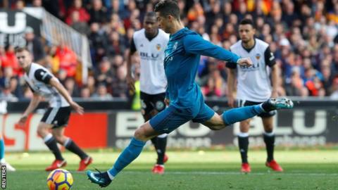 ReutersReal Madrid a obținut a doua victorie la rând în campionatul Spaniei! Formația pregătită de Zinedine Zidane a făcut spectacol tocmai pe terenul ocupantei locul III din Primera Division, Valencia. A fost 4-1 pentru gruparea Blanco. Cristiano Ronaldo (min. 16 și 38) a marcat primele două goluri ale disputei, ambele fiind din penalty. Santi Mina (min.58) a redus din diferență pentru gazde, dar Marcelo (min.84) și Toni Kroos (min.89) au securizat cele trei puncte pentru campioana Europei. După acest rezultat, Real Madrid s-a apropiat la 2 puncte de Valencia, fiind pe locul al patrulea. Pentru Cristiano Ronaldo a fost cel de-al doilea meci la rând când reușește o dublă.