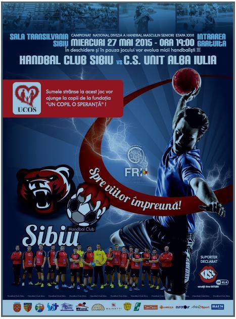 Ultima partidă din campionatul României în ediţia 2014-2015 pentru HC Sibiu va avea şi un scop nobil. La jocul de pe teren propriu al echipei noastre împotriva celor de la CS Unit Alba Iulia se vor pune în vânzare mingi cu autografele jucătorilor sibieni. Toate fondurile obţinute vor fi donate Fundaţiei „Un Copil O Speranţă”, fundaţie ce se ocupă cu sprijinirea copiilor cu nevoi speciale. Meciul va avea loc în această seară, în Sala Transilvania. Partida începe la ora 19, 00. Intrarea este liberă.