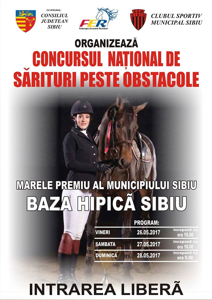 CALARIEClubul Sportiv Municipal Sibiu împreună cu Federația Ecvestră Română și Consiliul Județean Sibiu organizează și în acest an concursul de mare tradiție în echitație ”Marele Premiu al Municipiului Sibiu”. Evenimentul va avea loc la Baza Hipică din Vasile Aaron, în zilele de 26, 27 și 28 mai. În primele două, cu începere de la ora 10,00, iar în a treia, cu începere de la ora 09,00. Vor fi prezenți cei mai buni călăreți din țară. Sibiul va fi reprezentat de cei mai buni sportivi ai săi, printre care, Ionel Bucur sau Radu Ilioi. Intrarea este liberă, fanii sportului din orașul nostru sunt invitați să asiste la întrecerea desfășurată în aer liber.
