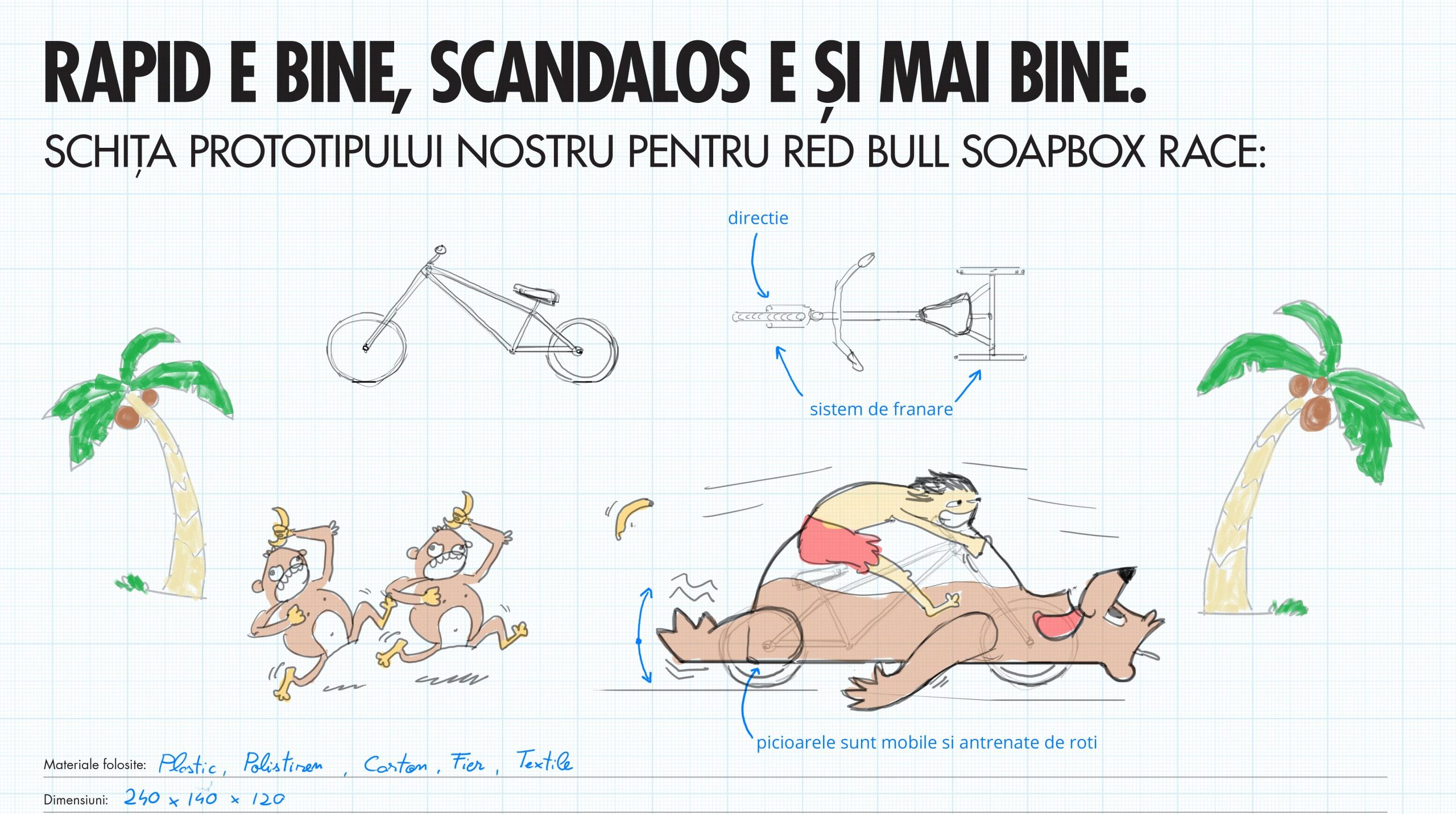 2 echipe din județul Sibiu au ajuns pe lista de start pentru cea mai trăsnită goană pe patru (sau mai puține) roți. Adică, aceștia sunt cei mai șmecheri și mai țăcăniți piloți de curse urbane din țară. Marea cursă va avea loc pe 3 Septembrie, în Parcul Colina din Cluj-Napoca, începând cu ora 11,00. Competiţia are numele de Red Bull Soapbox. „Shercozaur” și „Monkeybusiness” sunt formaţiile care vor reprezenta județul nostru. Ovidiu Vlad și Liviu Revnic sunt cei doi membri ai echipei Shercizaur, iar Cristian Popescu, Maria Lupașcu, Mihai Pop și Darius Palade reprezintă Monkeybusiness. Ei vin din satul Amnaș și sunt fani Cartea Junglei, de unde le-a venit și ideea bolidului.
