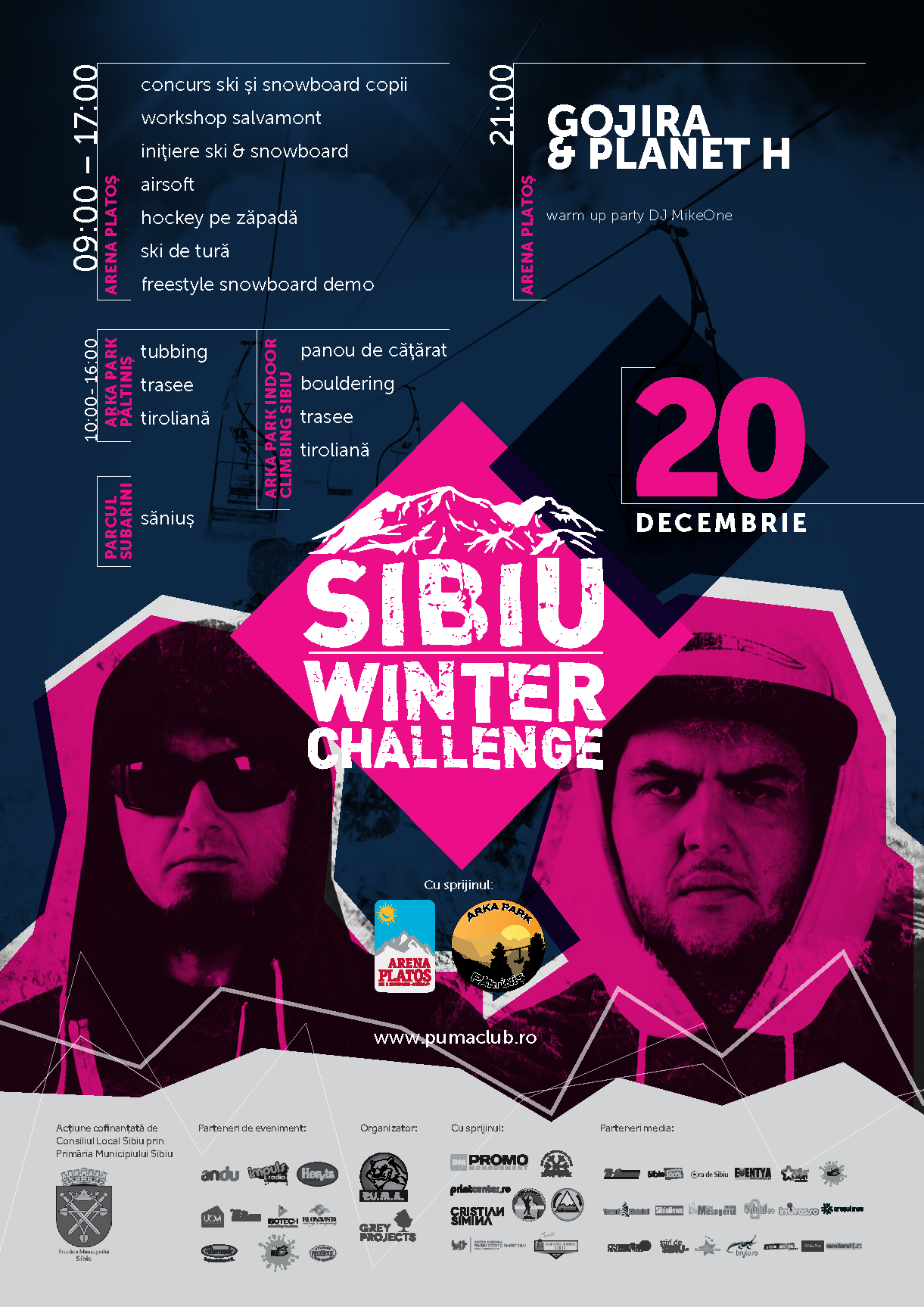 Sibiu Winter Challenge este un eveniment complex care îmbină activitățile specific sporturilor de iarnă cu distracția nocturnă, oferind participanților toate condițiile pentru practicarea unui sport de iarnă, sub supraveghere specializată. Pe lângă activitățile de la Arka Park, în cadrul “mini-olimpiadei de iarnă” vor avea loc la Arena Platoș concursuri de ski și snowboard, o demonstrație de freestyle snowboard și, în plus, vor fi amenajate următoarele zone de activități: sănii, workshop Salvamont, ski & snowboard monitor, freestyle (snowboard/ski), airsoft, hockey pe zăpadă, ski de tură, activități pentru copii. Evenimentul se va încheia spre seară cu o petrecere pe pârtia Arena Platoș, animată de concertul Gojira & Planet H.