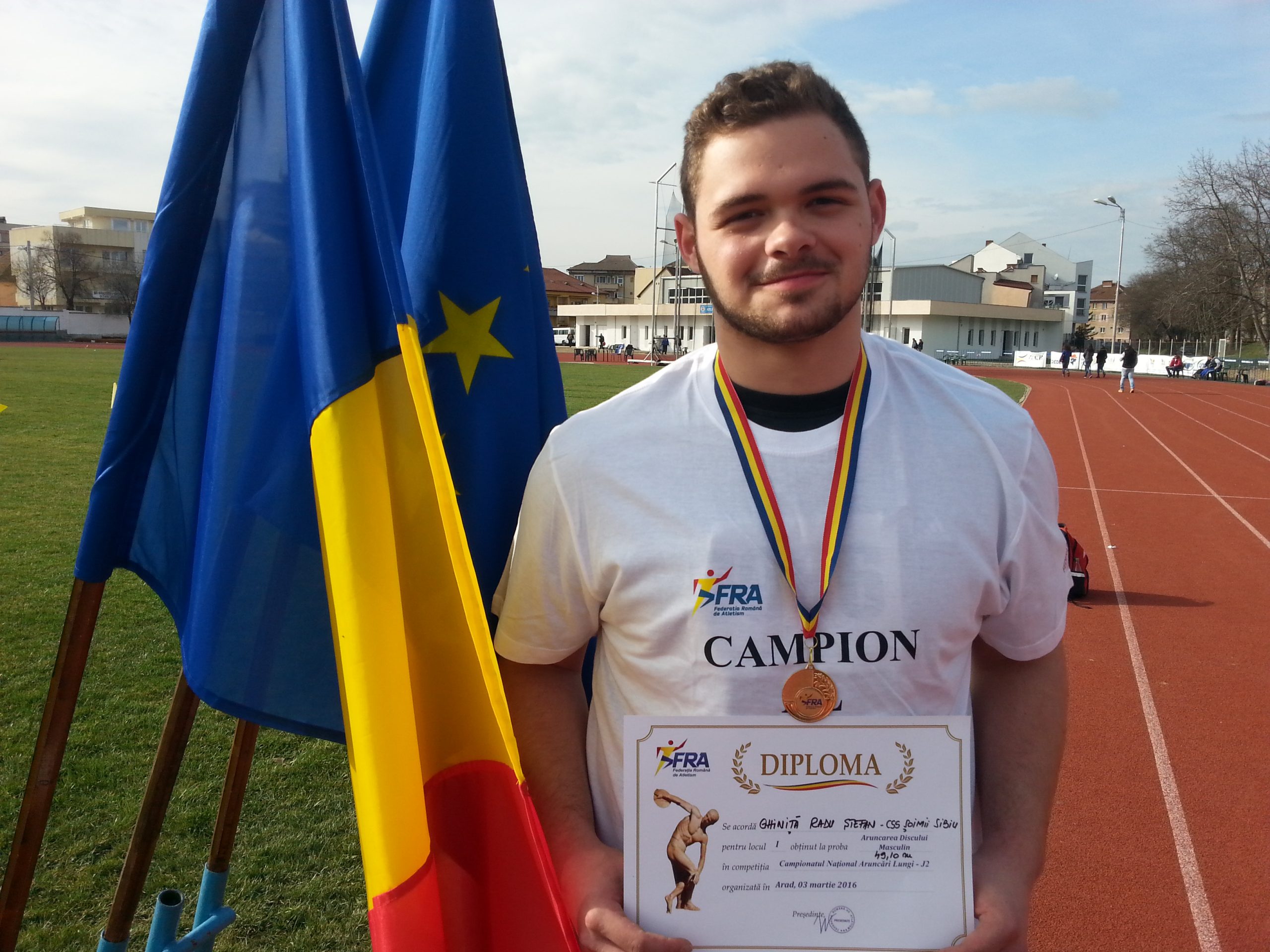 Radu Ghiniţă, locul III la aruncarea discului (43.71m) şi aruncarea greutăţii (14.01m) ; prof. Ligia Cuciorovschi