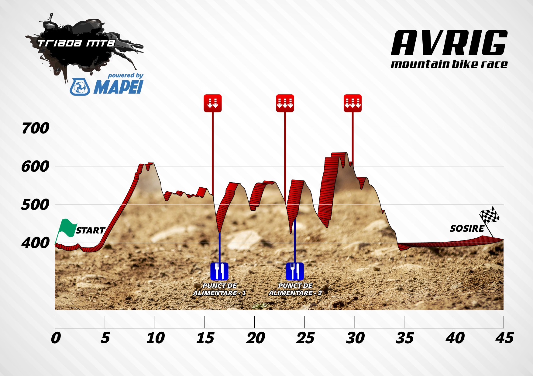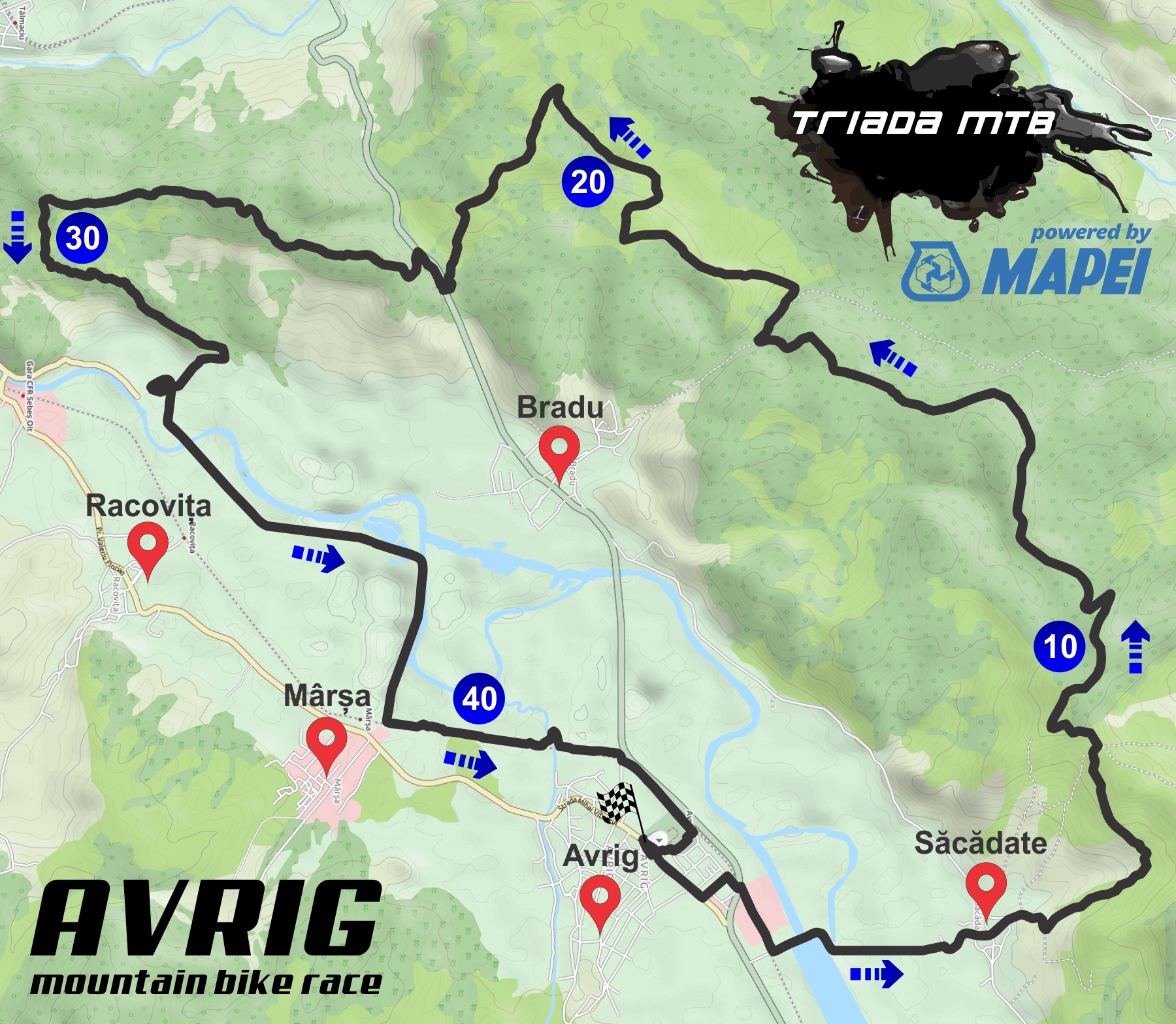 Triada MTB începe devreme în acest an cu o competiție numai bună pentru startul de sezon : Avrig Mountain Bike Race. Aşa se va numi prima etapă din întrecerea principală. Runda va avea loc duminică pe dealurile din jurul orașului Avrig. Traseul măsoară 45 km și are o diferență de nivel de 950 de metri. În cea mai mare parte, gradul de dificultate este unul mediu dar, există și câteva zone cu dificultate ridicată care îi vor pune la încercare pe cei peste 200 de participanți care se anunță a fi prezenți la start. Zona aleasă de organizatori este una deosebită din punct de vedere al peisajelor, în multe puncte ale traseului putând fi admirate panorame ale Țării Oltului sau ale Munților Făgăraș. Startul se va da la ora 11:00 din centru orașului Avrig.
