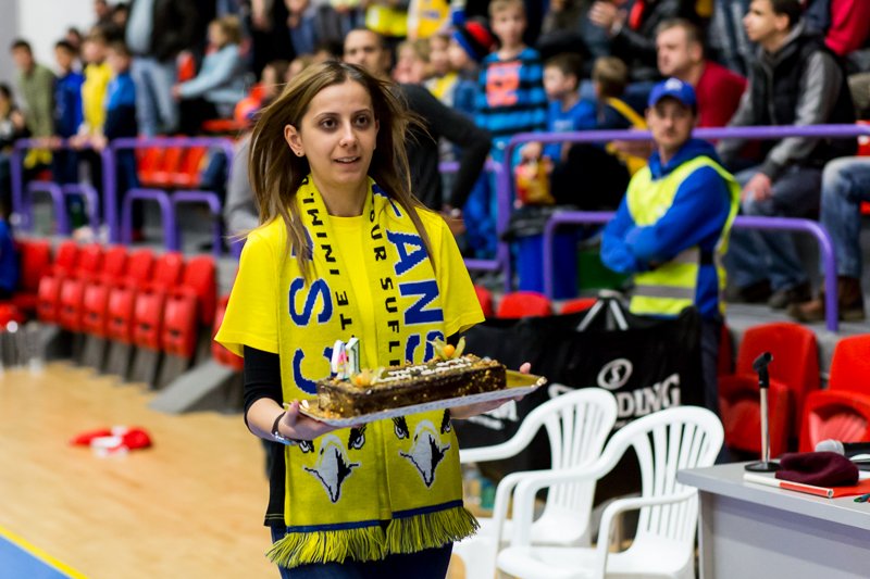 www.csufans.roJocul cu Dinamo Bucureşti a reprezentat o dublă sărbătoare pentru antrenorul principal al lui CSU Sibiu, Dan Fleşeriu. Tehnicianul „vulturilor” a avut două motive de bucurie, victoria cu 86 la 82 în faţa „câinilor roşii” şi celebrarea zilei sale de naştere. Eveniment ce a fost sărbătorit şi cu suporterii echipei sale de suflet. Fani care i-au înmânat un tort înaintea disputei de aseară, din Sala Transilvania, şi care i-au cântat la mulţi ani, la finalul partidei. Fleşeriu a împlinit vârsta de 41 de ani.