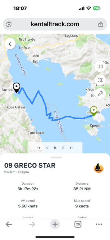 Un petrolier mare sună din sirena lui. Îl contactăm pe stația radio și îl întrebăm dacă are treabă cu noi. Răspunde că da și facem o voltă ca să nu îl încurcăm. După această manevră, drumul spre sosire este liber. Vântul s-a rotit și mai convenabil și acum nu mai avem nevoie de volte, mergem dinspre est, direct spre Eghina.