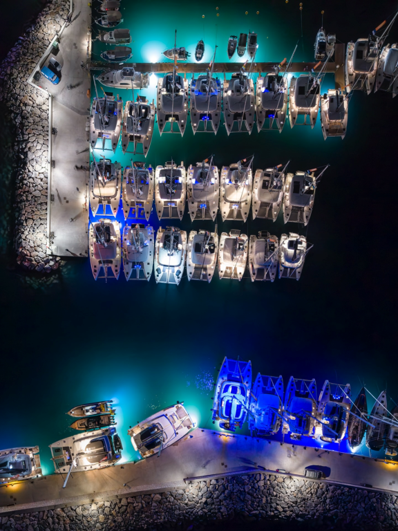 Seara din nou petrecere, din nou muzică și dans. Copiii pescuiesc la lumina subacvatică a marinei din Astros Paralia.