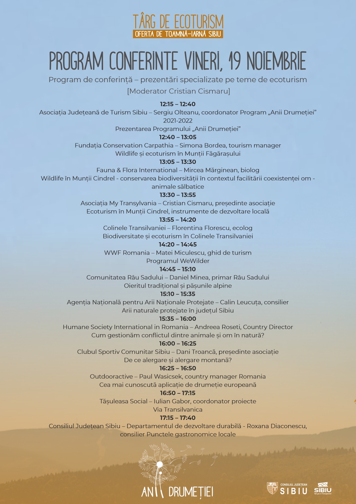 le conexe, cum ar fi punctele gastronomice locale, facilitățile de cazare sau producătorii locali de echipament sportiv. Toate acestea pot fi explorate pe 19 și 20 noiembrie, la Târgul de Ecoturism.” declară Sergiu Olteanu, coordonatorul Programului „Anii Drumeției”.
