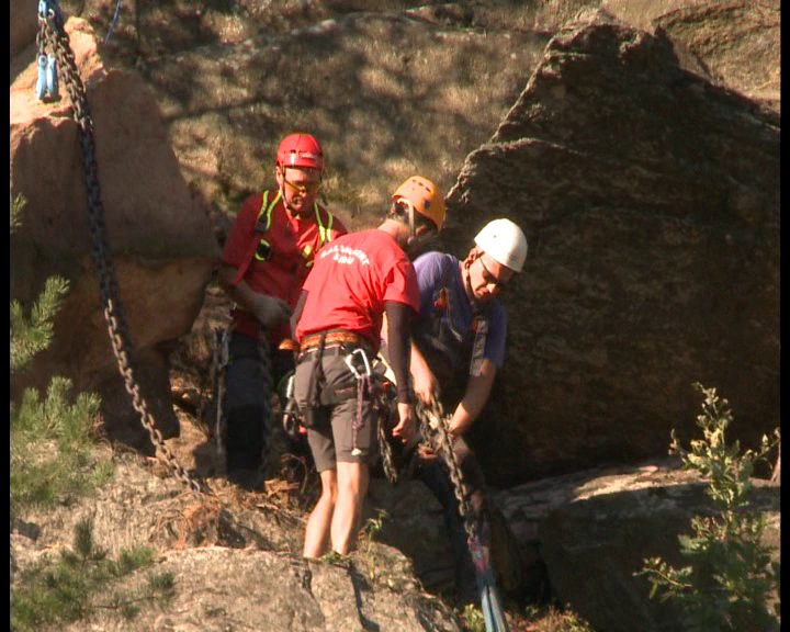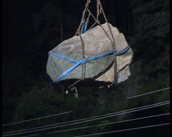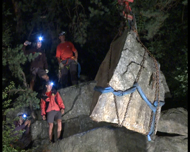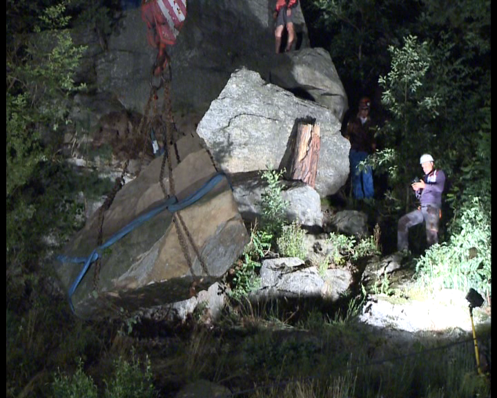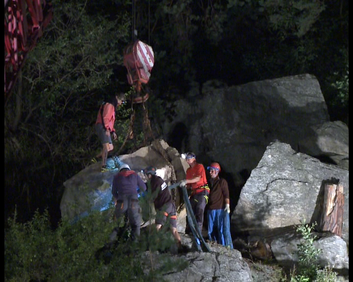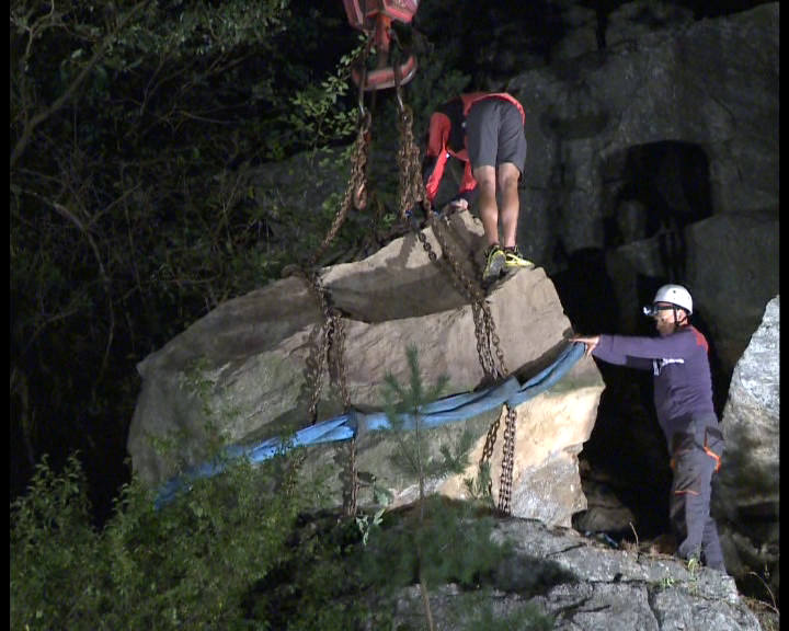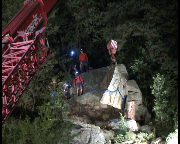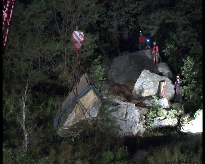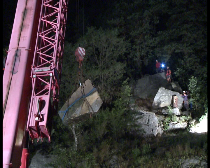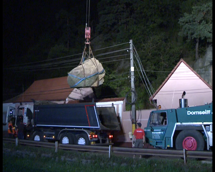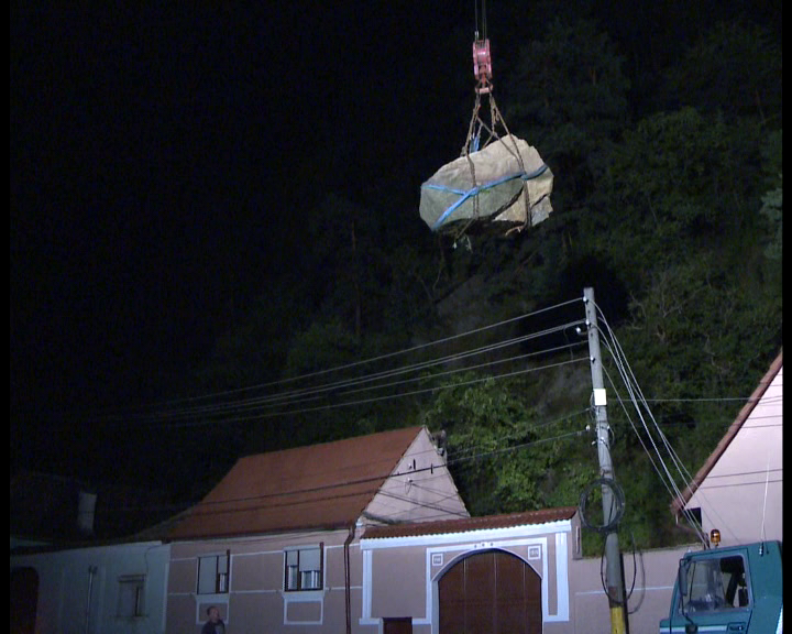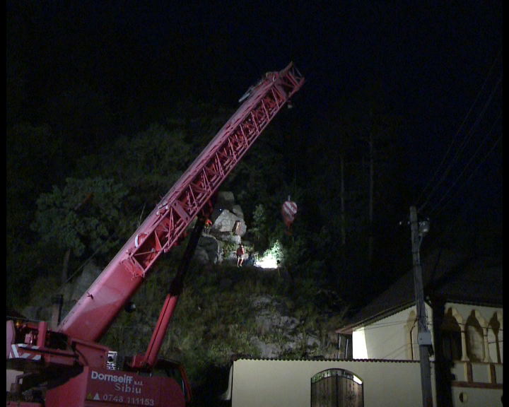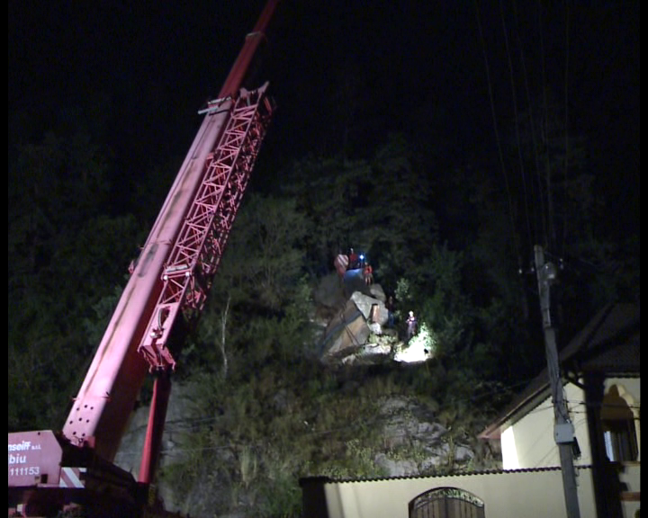 Operaţiune extrem de dificilă la Tilişca. Autorităţile au intervenit miercuri seară pentru a coborî de pe versant stâncile desprinse. S-a lucrat mai bine de 6 ore până când cele două bucăţi uriaşe de piatră au fost înlăturate. A fost nevoie de o macara de mare tonaj şi o echipă de alpinişti utilitari.