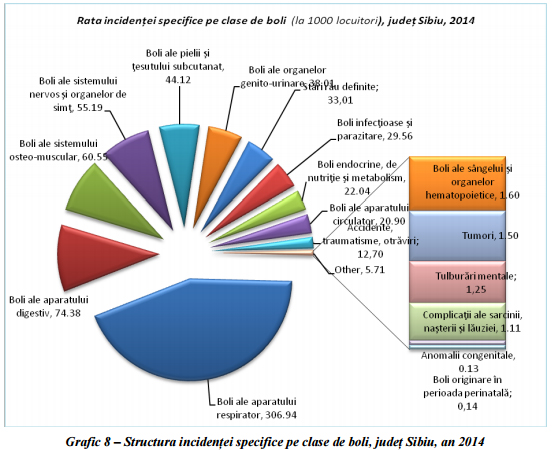 În județul Sibiu au fost înregistrate un număr total de 325.856 cazuri noi de îmbolnăvire, rata incidenței generale fiind de 703,130/00. În ceea ce privește cauzele de îmbolnăvire, situația primelor trei cauze este, în ordine descrescătoare, după cum urmează:
