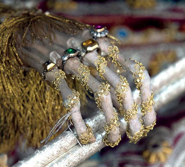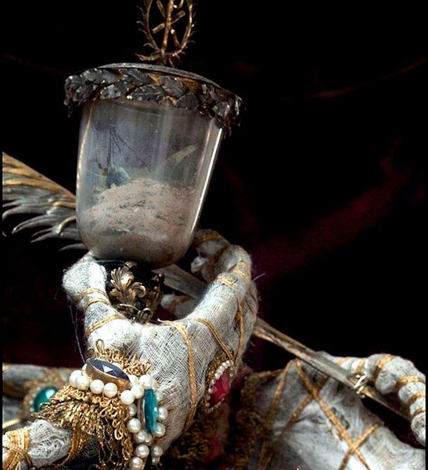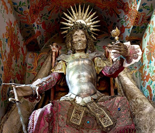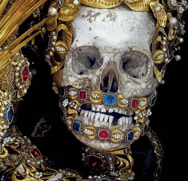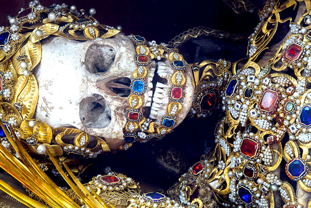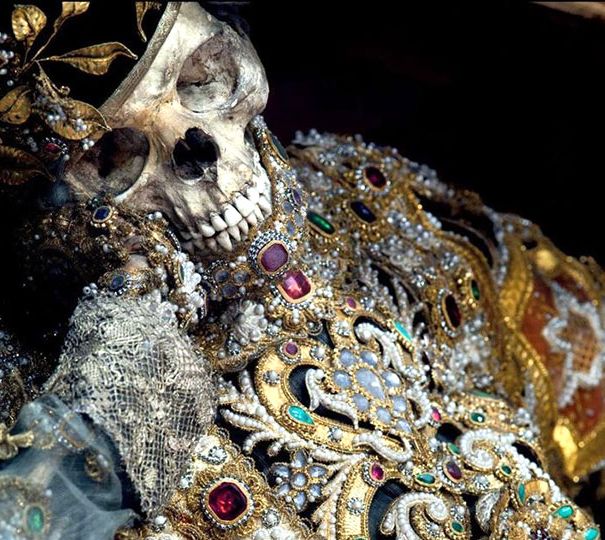 Scheletele sunt decorate cu sute de pietre preţioase şi kilograme de aur şi argint. Sfinţii din Catacombe fotografiaţi de Koudounaris pentru noua sa carte intitulată Empire of Death (Imperiul Morţii), sunt scheleți dezgropaţi din catacombele romane în secolul al 16-lea, şi aşezaţi în biserici din Germania, Austria şi Elveţia, la ordinele Vaticanului, pentru a înlocui relicvele sacre distruse în timpul Reformei Protestante din 1500.